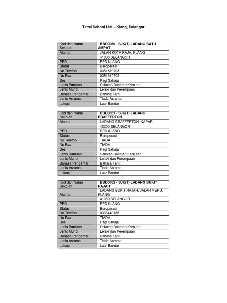 KLANG Kod dan Nama Sekolah BBD0060 - SJKT LADANG BATU AMPAT Alamat JALAN KOTA RAJA KLANG 41000 SELANGOR PPD PPD KLANG Status Beroperasi No Telefon 0351619703 No Fax 0351619703 Sesi Pagi Sahaja Jenis Bantuan Sekolah Bantuan Kerajaan Jenis Murid Lelaki dan Perempuan Bahasa Pengantar. Sekolah Agama Menengah Hulu Langat. BBC0041 Lokasi Sekolah.